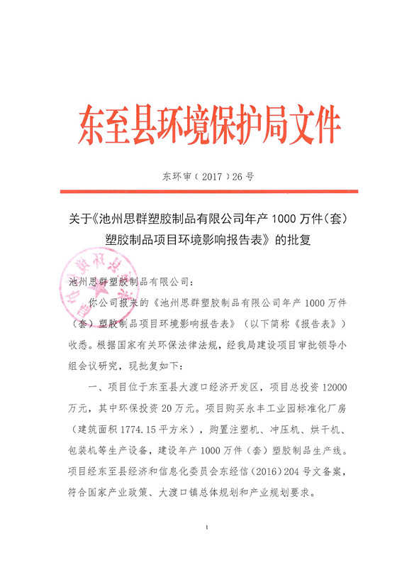 關于《池州思群塑膠制品有限公司年產1000萬件(套)塑膠制品項目環境影響報告表》的批復